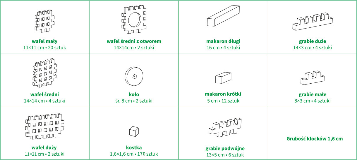 - 14 klocków w kształcie "grabii" w 3 różnych rozmiarach